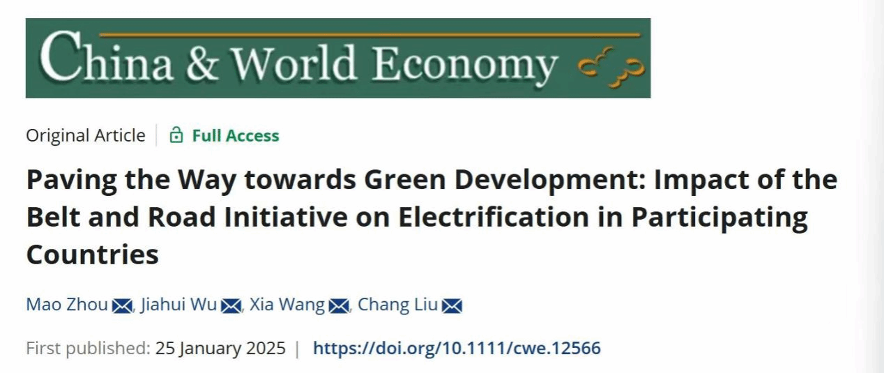 我们王霞副教授与国际商学院周茂教授、武家辉博士,西部经济研究院刘畅副教授的合作论文《Paving the Way towards Green Development: Impact of the Belt and Road Initiative on Electrification in Participating Countries》在国际知名期刊《China & World Economy》2025年第1期正式发表。