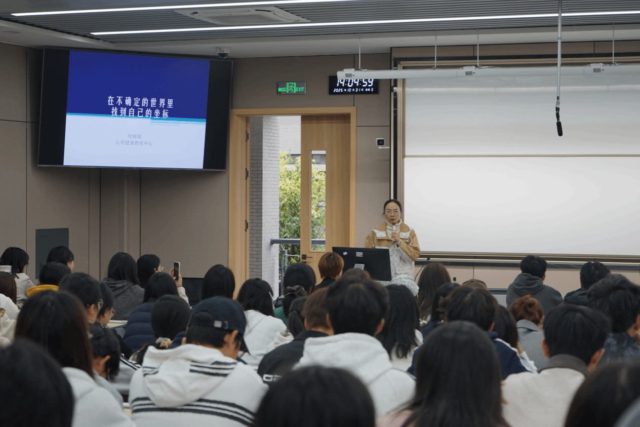 2025年10月31日下午,永利yl23411集团官网学生心理工作站主办的校园心理文化月专题讲座在经世楼E103教室顺利举办。讲座主题为“从‘心’出发:在不确定的世界里,找到自己的坐标”,校心理健康教育中心何媛媛老师应邀主讲,160余新生参与。